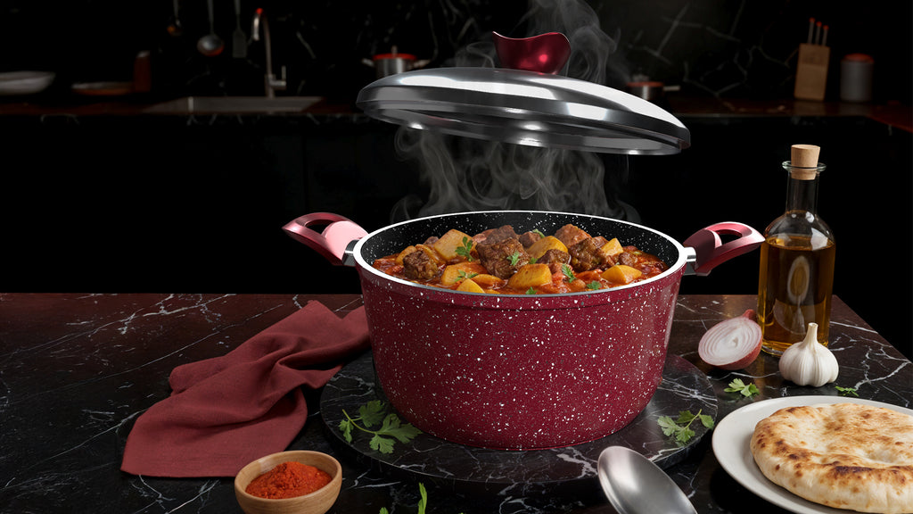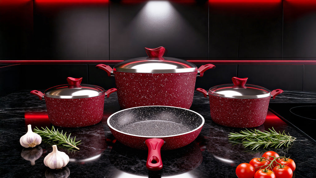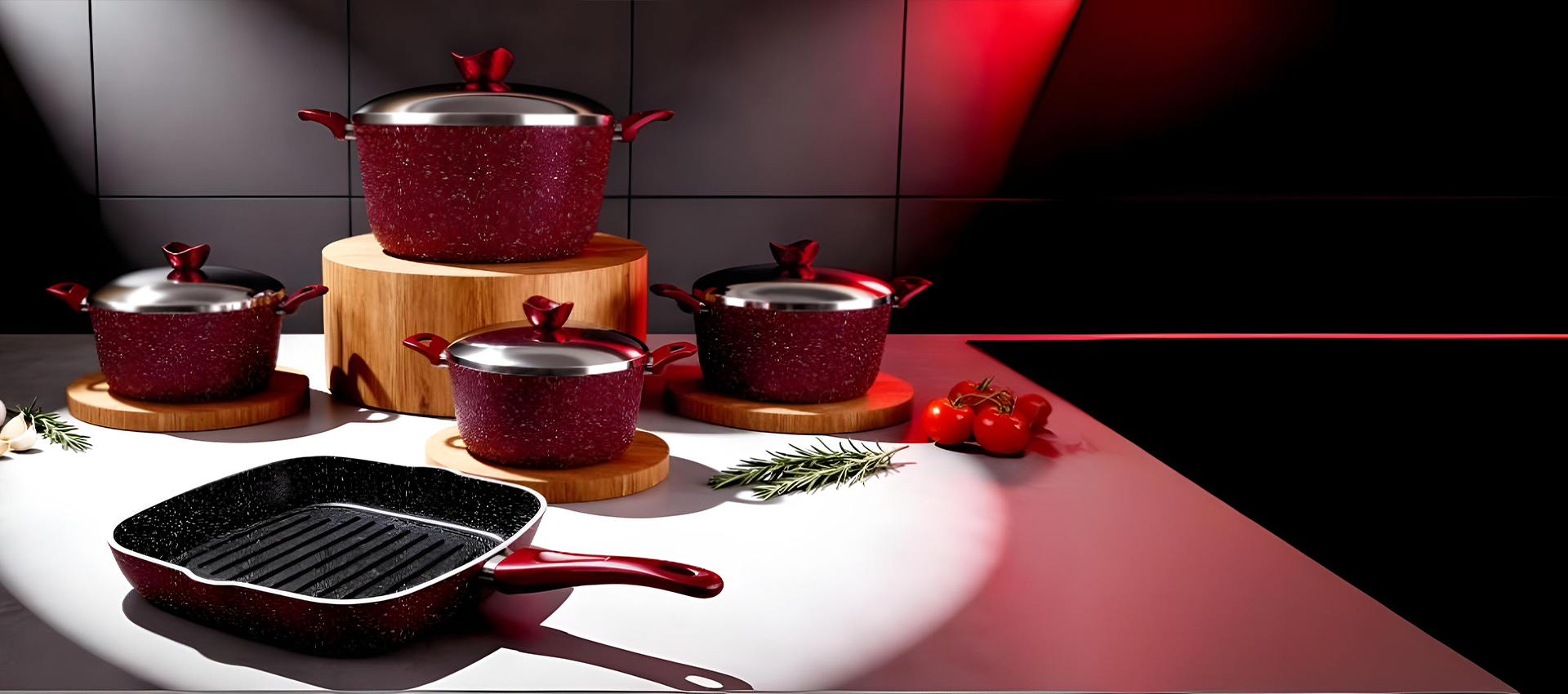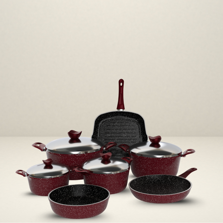 طقم حلل جرانيت أحمر أنيق مكون من 11 قطعة بتصميم عصري يجمع بين القوة والجمال. يتميز بطلاء جرانيت إيطالي غير...