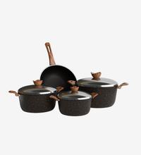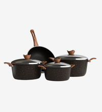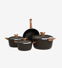 طقم حلل جرانيت اسود 7 قطع و ووك بمقابض بكاليت خشبية - بريميوم سٌمك 5 مم