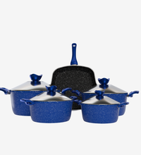 طقم حلل جرانيت باللون الأزرق من تيرينوفا الخيار المثالي لمطبخك العصري. يتميز بتصميم أنيق ومتين مكوّن من 9 قطع تشمل 4 حِلل بأحجام متنوعة وجريل بمقاس 28 سم، مما يتيح لك الطهي بسهولة لجميع الوصفات. صُمم لتحمل الاستخدام اليومي وتوزيع الحرارة بالتساوي لتحقيق أفضل نتائج الطهي.