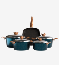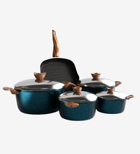 طقم حلل جرانيت تركواز بريميوم يتكون من 9 قطع تشمل 4 أحجام من الحِلل وجريل 28 سم. يتميز بقاعدة سميكة بسمك 5 مم لتوزيع حرارة متوازن وطلاء غير لاصق عالي الجودة يدوم طويلًا. مناسب للاستخدام اليومي والطهي الصحي مع سهولة التنظيف بعد كل استخدام.