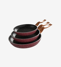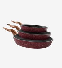 طقم مقلاية جرانيت احمر 3 قطع بمقبض خشبي - بريميوم سٌمك 5 مم