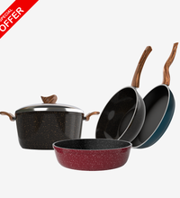 حلة جرانيت مقاس 24 سم + صينية جرانيت مقاس 28 سم + ووك جرانيت مقاس 28 سم + مقلاية جرانيت مقاس 24 سم، اللون حسب المتوفر، مصنوعين من جرانيت عالي الجودة بسمك 5 مم، مع طبقة غير لاصقة تساعد على الطهي بدون التصاق وسهولة التنظيف.