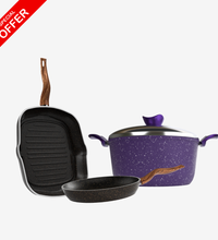 حلة جرانيت مقاس 24 سم + مقلاية جرانيت مقاس 24 سم + جريل جرانيت، اللون حسب المتوفر، مصنوعين من جرانيت عالي الجودة بسمك 5 مم، مع طبقة غير لاصقة تساعد على الطهي بدون التصاق وسهولة التنظيف.