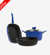 حلة جرانيت مقاس 28 سم + جريل جرانيت + صينية جرانيت مقاس 24 سم، اللون حسب المتوفر، مصنوعين من جرانيت عالي الجودة بسمك 5 مم، مع طبقة غير لاصقة تساعد على الطهي بدون التصاق وسهولة التنظيف.