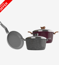 حلة جرانيت مقاس 28 سم + حلة جرانيت مقاس 20 سم + مقلاية جرانيت مقاس 24 سم، اللون حسب المتوفر، مصنوعين من جرانيت عالي الجودة بسمك 5 مم، مع طبقة غير لاصقة تساعد على الطهي بدون التصاق وسهولة التنظيف.