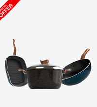 جريل جرانيت + ووك جرانيت + حلة جرانيت مقاس 28 سم، اللون حسب المتوفر، مصنوعين من جرانيت عالي الجودة بسمك 5 مم، مع طبقة غير لاصقة تساعد على الطهي بدون التصاق وسهولة التنظيف.