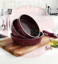 طقم 3 صواني جرانيت باللون البوردو من تيرينوفا يجمع بين الفخامة والمتانة في تصميم أنيق يدوم طويلاً. بطلاء مبتكر غير لاصق لتقليل الالتصاق وسهولة التنظيف، مع توزيع حراري متساوي يضمن نتائج متقنة. تصميم عملي يناسب جميع الاستخدامات اليومية.